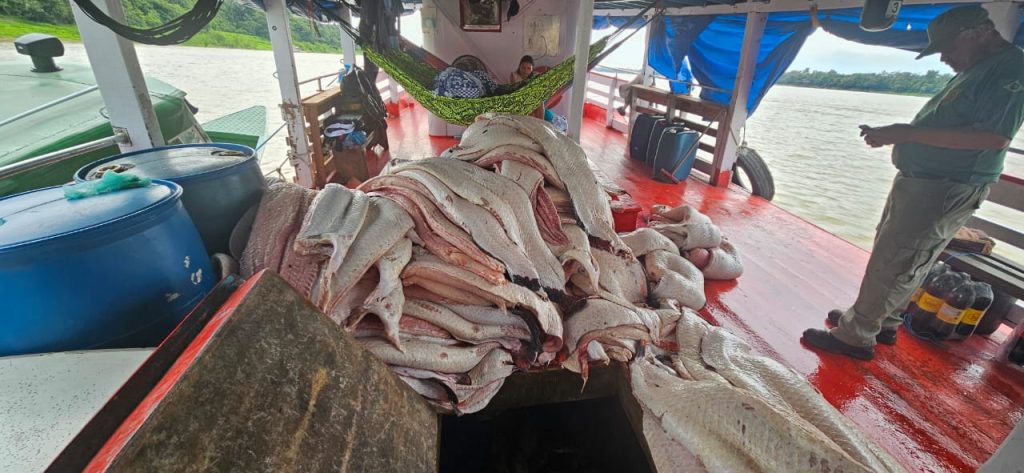 Outra embarcação recreio, denominada “Terceiro”, também foi abordada transportando 467 quilos de tambaqui ruelo, 516 quilos de pirarucu em manta, 150 quilos de pirarucu seco e carnes de caça. Na mesma área, um barco sem identificação foi encontrado com 91 quilos de tambaqui ruelo. Somadas, as apreensões ultrapassam quatro toneladas e meia de pescado retirado ilegalmente da Unidade de Conservação.