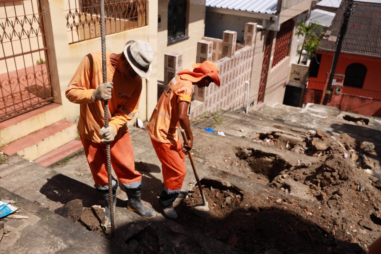 As equipes deram início à escavação manual para realizar o anelamento de oito metros da tubulação que estava desalinhada, causando a fuga de material e ocasionado a abertura de crateras na escadaria. Isso ocorre quando o acúmulo de lixo obstrui a passagem de água e, durante as fortes chuvas, a força das águas represa e impulsiona o equipamento, provocando o desalinhamento dos tubos até que a água crie uma rota de fuga.