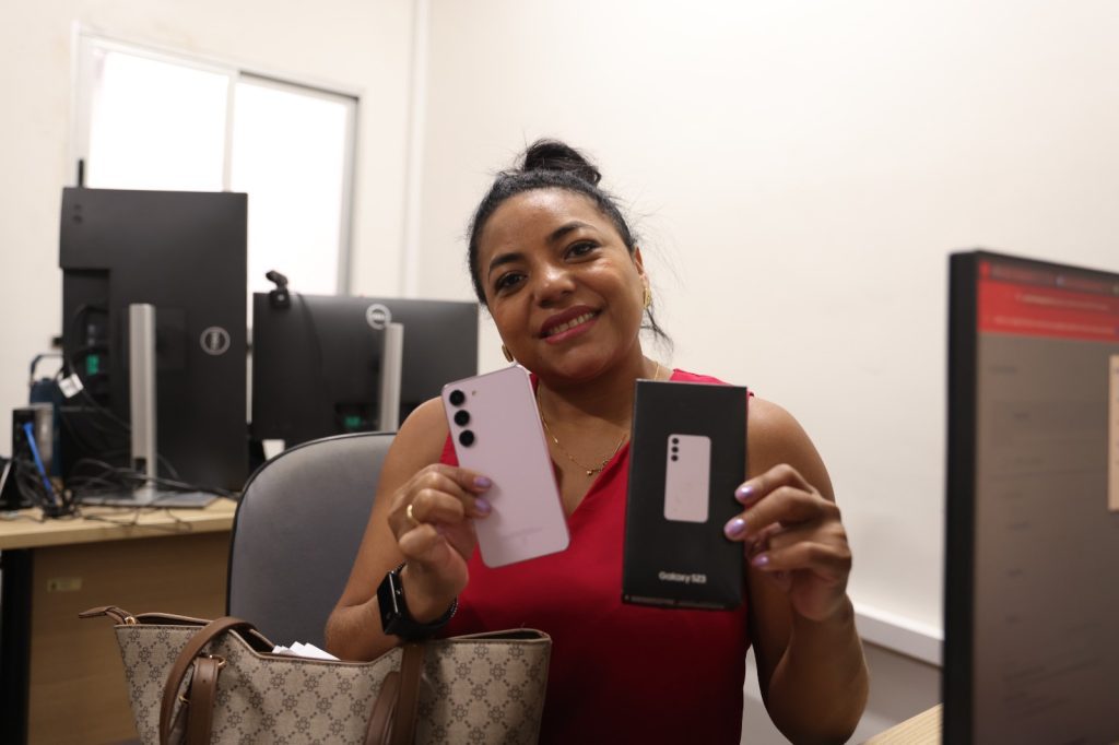 A auxiliar administrativa Cleiane Salgado, demonstrou satisfação ao ter o celular recuperado após encontrar seu nome na lista do Programa RecuperaFone. “Vi meu nome, fiquei tão feliz com o celular e hoje eu estou aqui recuperando em perfeito estado. E eu fico muito feliz pela polícia não desistir e ter esse NOVO programa, que a gente não tinha e esse programa RecuperaFone é de verdade”, destacou a auxiliar administrativa.