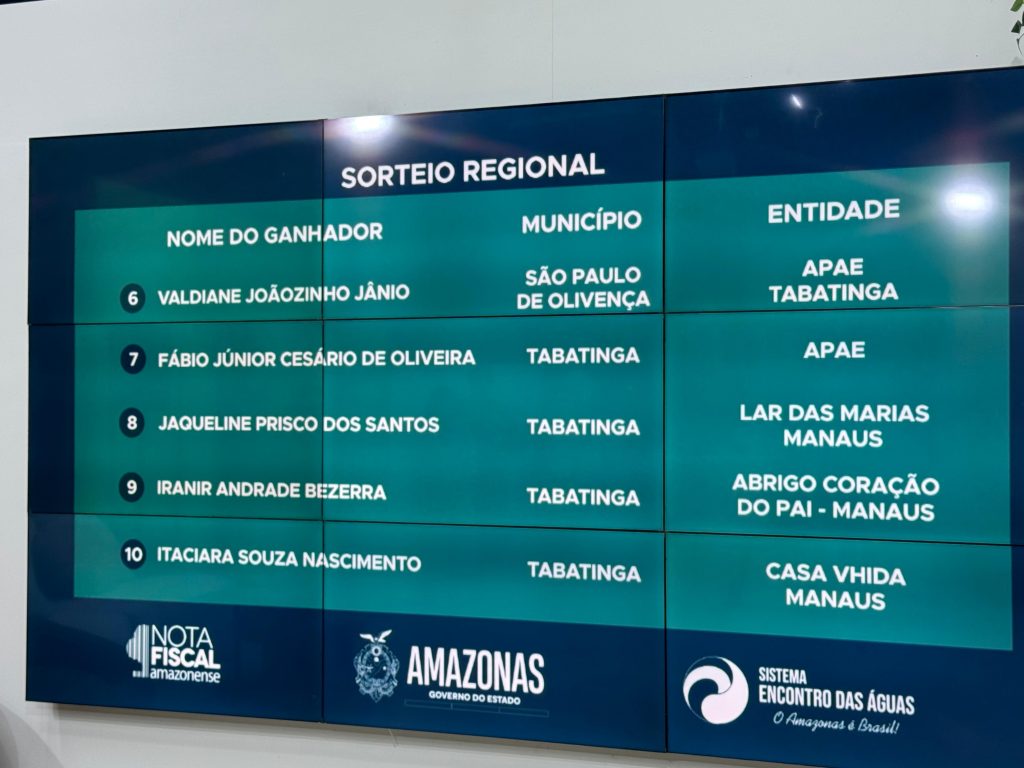 O sorteio regional deste mês contemplou moradores dos municípios de Tabatinga, Amaturá, Atalaia do Norte, Barcelos, Benjamin Constant, Carauari, Japurá, Juruá, Jutaí, Santa Isabel do Rio Negro, Santo Antônio do Içá, São Gabriel da Cachoeira, São Paulo de Olivença e Tonantins. As cidades fazem parte da Região I, definida conforme o regulamento e o cronograma da nota fiscal Amazonense.