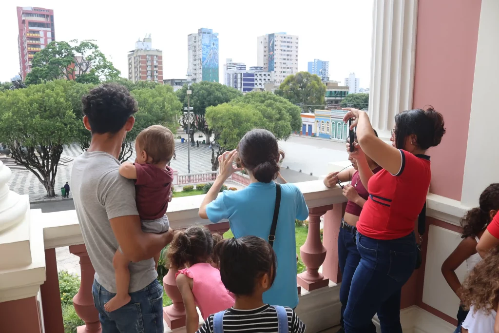 Pensando no acolhimento e nos cuidados com a população migrante, refugiada e apátrida, a Secretaria de Estado de justiça, direitos humanos e Cidadania (SEJUSC), por meio da Gerência de Migração, Refúgio, Enfrentamento ao Tráfico de Pessoas e trabalho escravo (Gmig), realizou uma visita cultural ao Teatro Amazonas, localizado no centro, com os albergados do Posto de Recepção e Apoio ao Migrante e Refugiado (PRA), nesta sexta-feira (30/01).